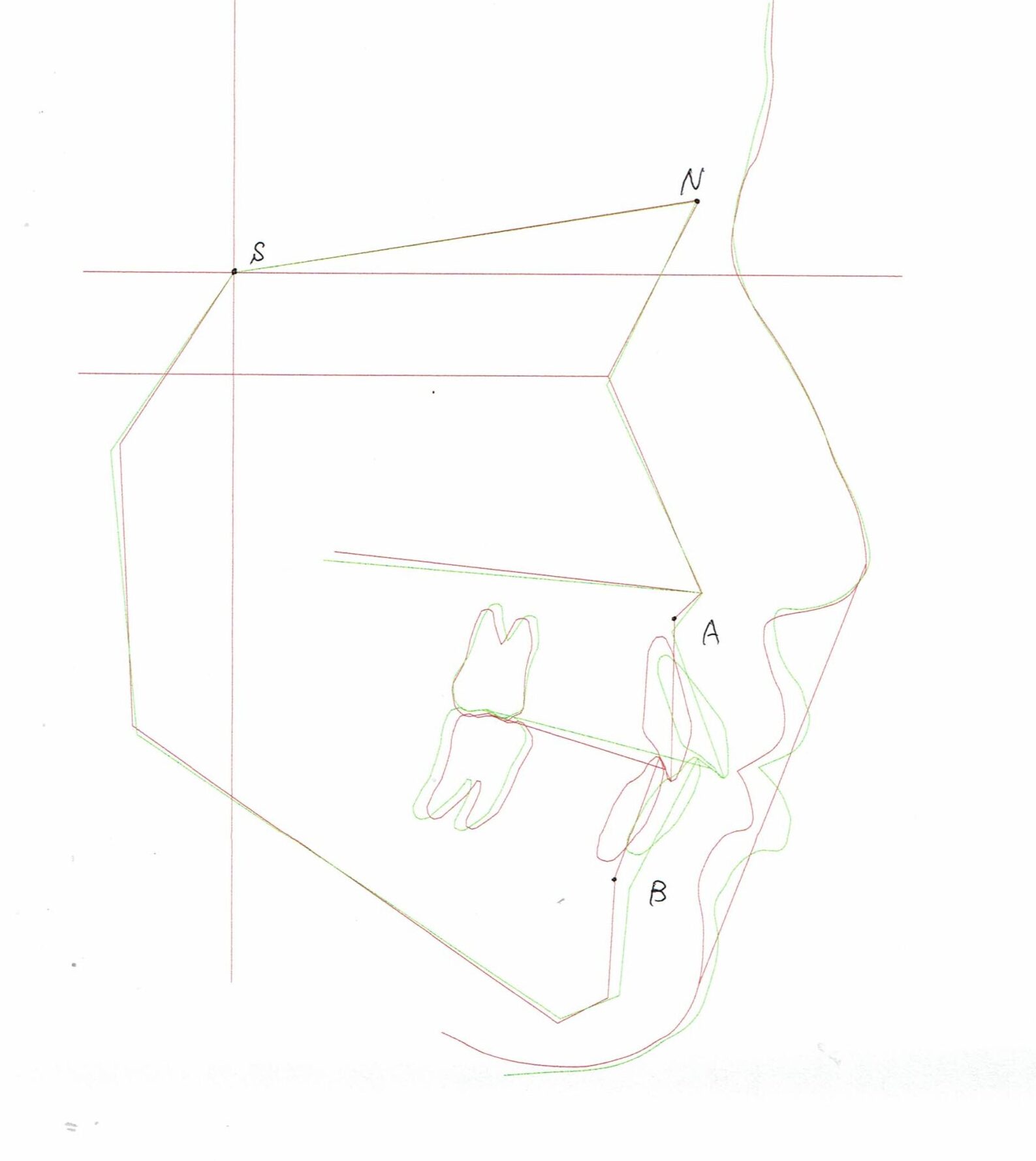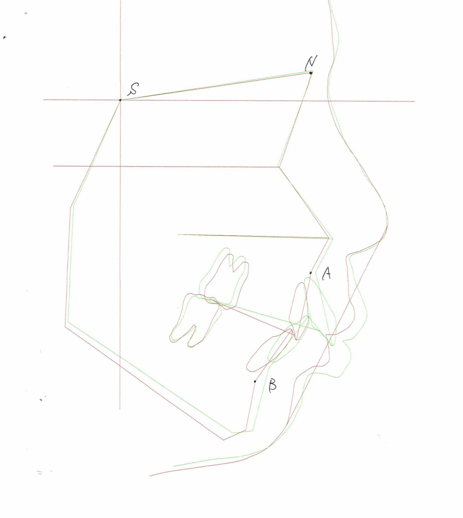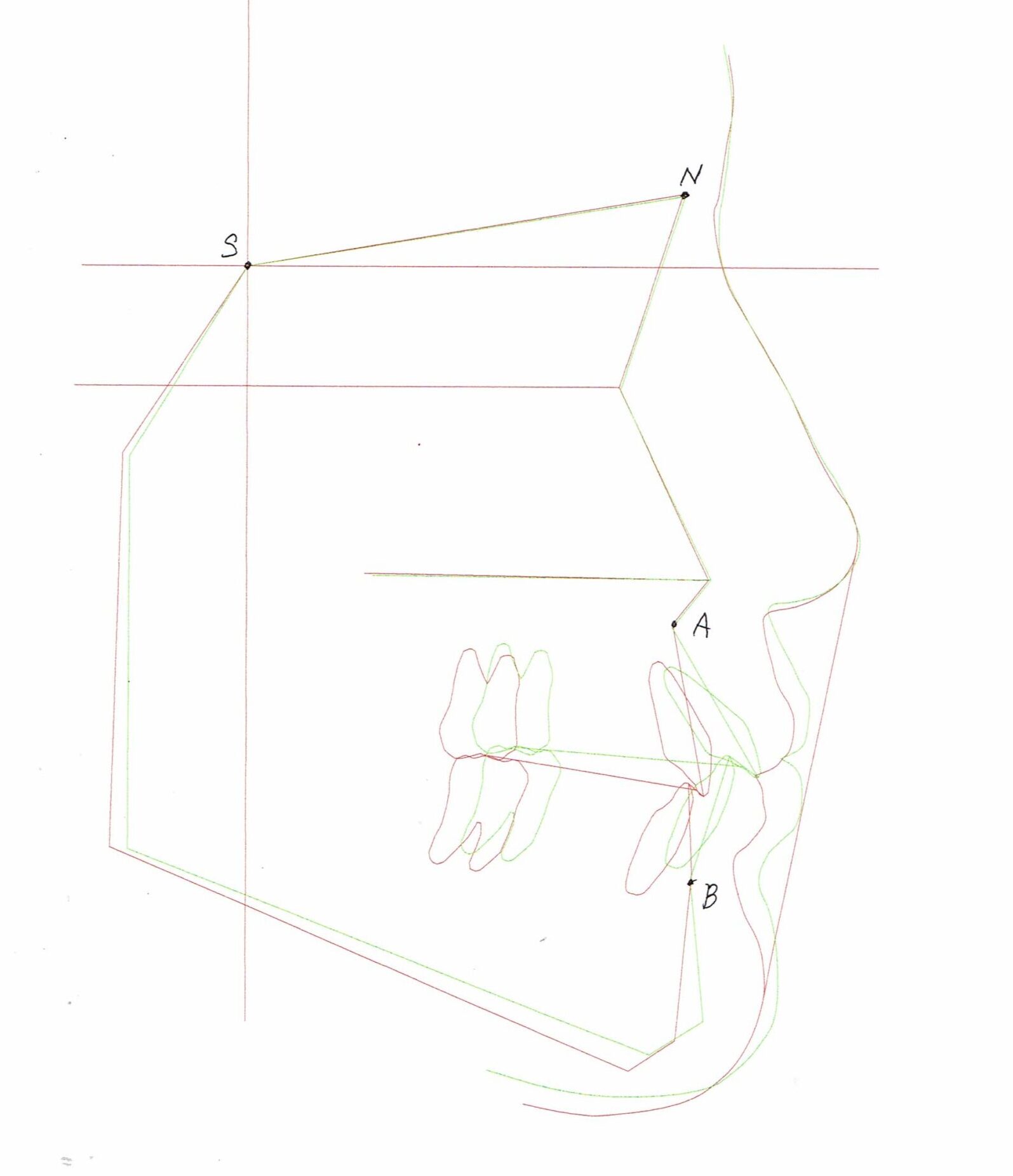 セファログラムのトレースの重ね合わせ(緑:治療前、赤:治療終了時)