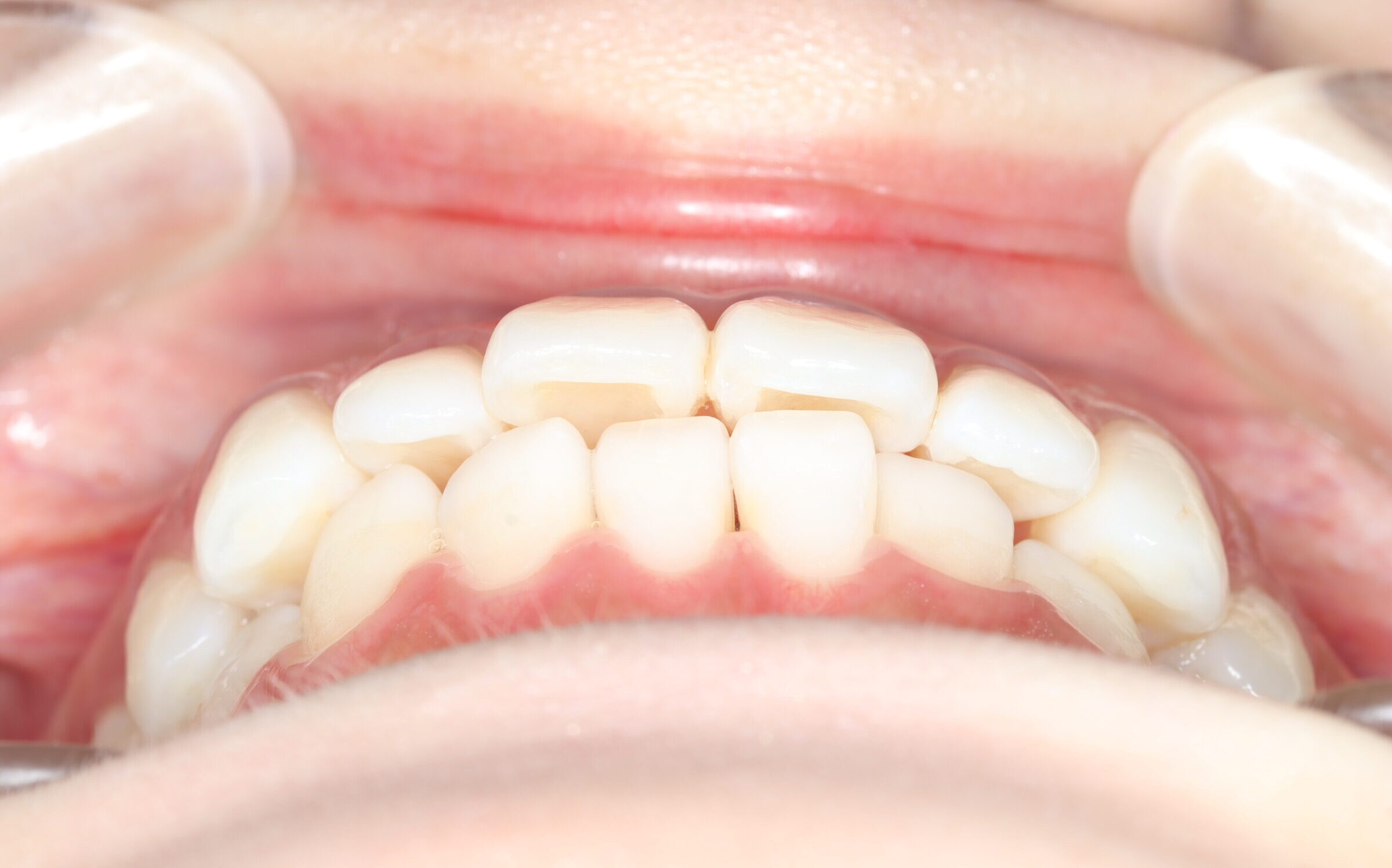 | 治療前 | 骨格的には受け口の患者さんですが、上顎前歯の唇側傾斜が大きく、患者さんとしては出っ歯だと思われていたパターンです。 元々口元の突出感はほとんどなかったため、歯を抜かずに上下顎ともに歯列を後方に移動させることにより主訴を改善させることとしました。 |